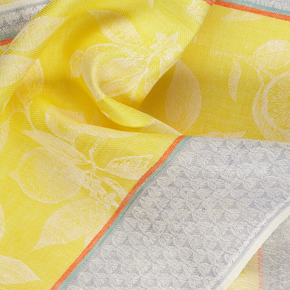 IL085 Lemon is a Jacquard cloth created by weaving different color threads to create intricate patterns - or paintings woven with thread. This particular design carries a lemon pattern with asymmetrical borders as a modern take on a traditional design. The fact that the borders are uneven forces us to create harmony, to go a little beyond what we usually do.