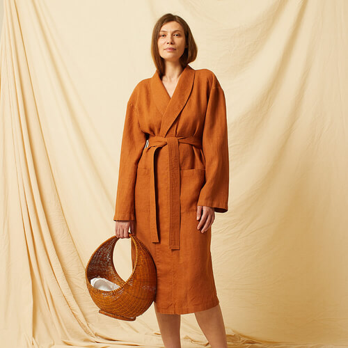 what linen and what color of linen is that beautiful burnt orange in the sample photo of the robe above pls?